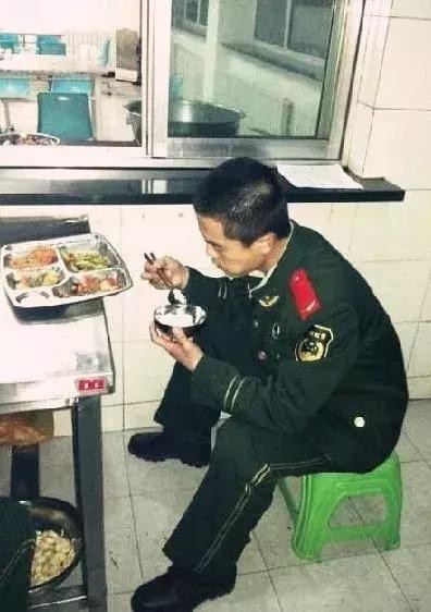 是穿着军装吃饭的侧影。