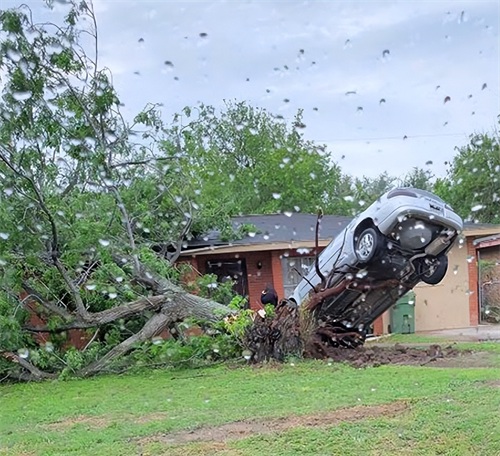 暴风雨吹倒了一棵树,它的根抬起了停在它旁边的汽车