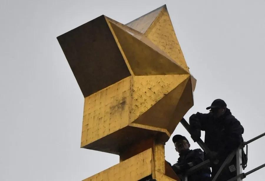 工人于2023年11月4日在基辅拆除苏联时代第二次世界大战英雄城纪念碑方尖碑的金星。