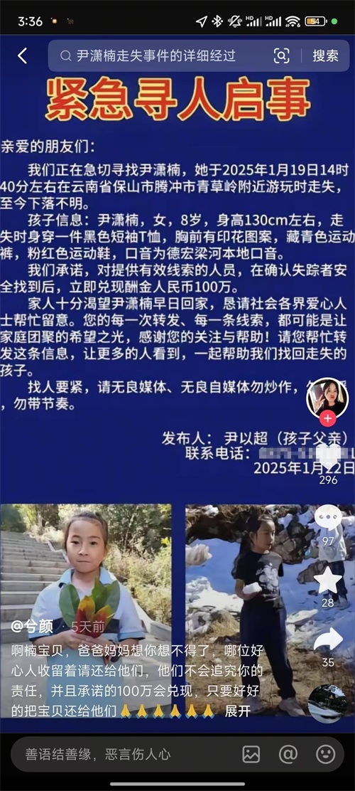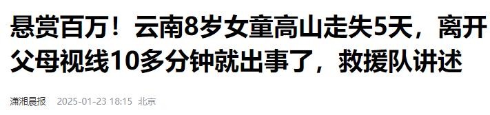【2】2025年1月23日发布 官方媒体 潇湘晨报《悬赏百万!云南8岁女童高山走失5天,离开父母视线10多分钟就出事了,救援队讲述》