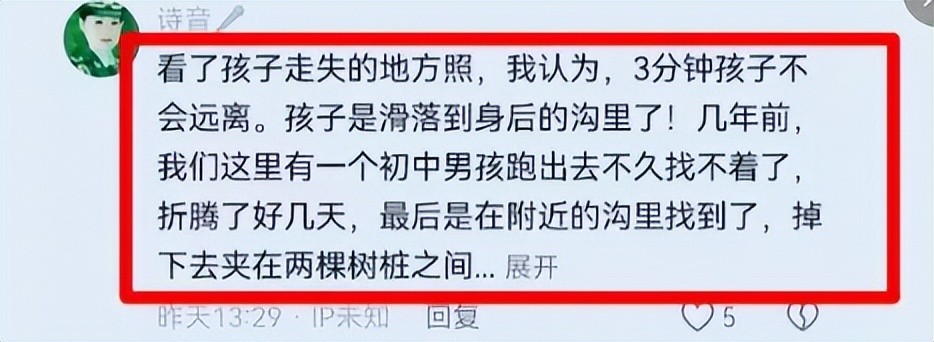 也有的网友认真分析了这个案件,称孩子可能掉到身后的沟里了,几年前有个男孩就是在那里找到的。