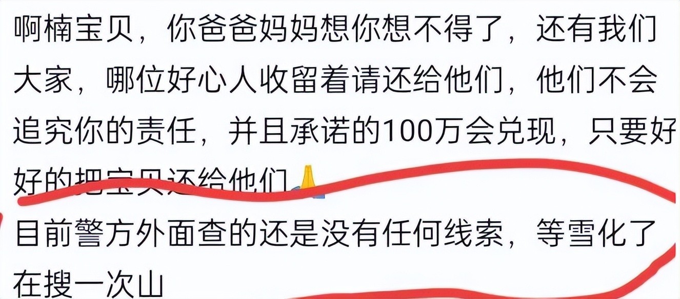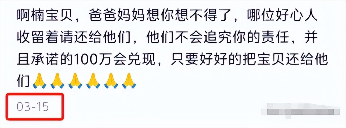 【3】2025年3月15日发布 兮颜《啊楠宝贝,爸爸妈妈想你想不得了,哪位好心人收留着请还给他们,他们不会追究你的责任,并且承诺的100万会兑现,只要好好的把宝贝还给他们》