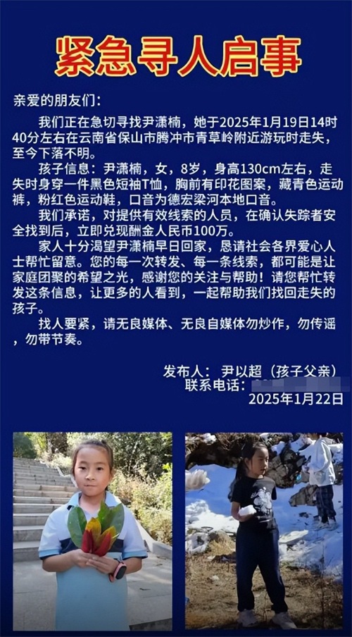 8岁女童叫尹潇楠,于2025年1月19日下午2点40分左右失踪。