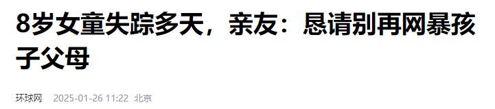 【1】2025年1月26日发布 官方媒体 环球网《8岁女童失踪多天,亲友:恳请别再网暴孩子父母》