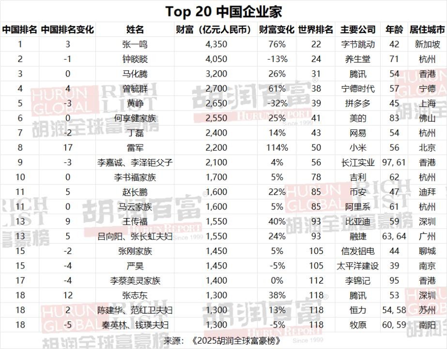 据悉,这是胡润研究院连续第14年发布“全球富豪榜”,上榜企业家财富计算的截止日期为2025年1月15日。