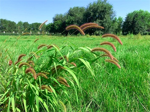 跟狗尾草很像的还有它的亲戚金狗尾草和大狗尾草。金狗尾草花穗呈现黄褐色,迎着阳光金黄色一片很是好看,而大狗尾草植株和花穗都比狗尾草大,并且花穗不像狗尾草这样顶立,而是会弯弯地垂下去。不过要说到大,那必须还得是狼尾草,狼尾草可比那几种“狗尾巴”要大上几个维度了,以至于经常有人看到后感叹,这狗尾草长的真大。狼尾草刚毛呈现金色,所以原来管它叫金色狗尾草,后来才被划到狼尾草属中。在有风的日子,一大片的狼尾草颇有风吹麦浪的感觉。