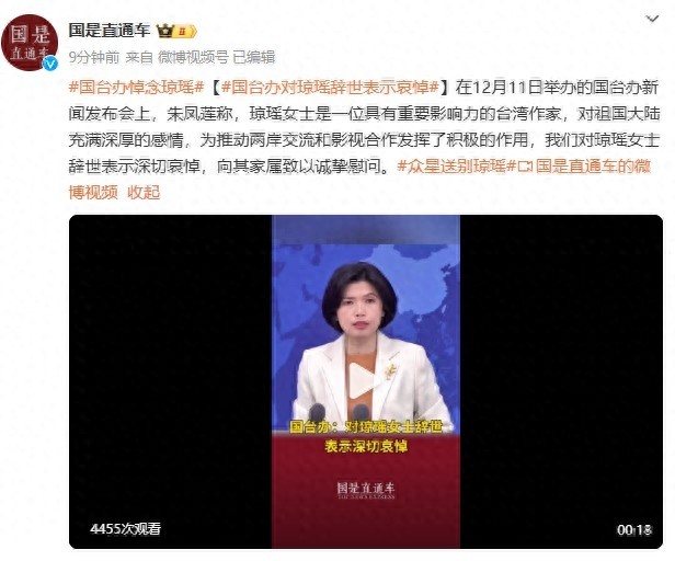 在12月11日举办的国台办新闻发布会上,朱凤莲称,琼瑶女士是一位具有重要影响力的台湾作家,对祖国大陆充满深厚的感情,为推动两岸交流和影视合作发挥了积极的作用,我们对琼瑶女士辞世表示深切哀悼,向其家属致以诚挚慰问。