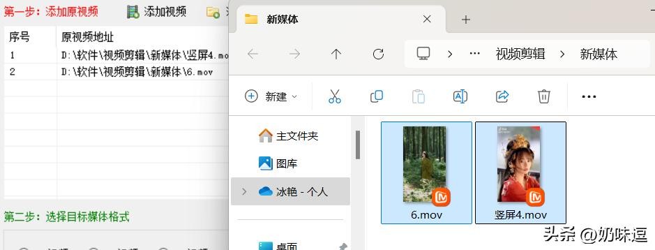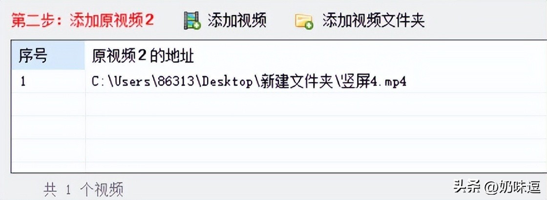 7.回到软件,在批量合并视频板块中,在添加原视频1列表中,通过添加视频导入一个或多个视频素材