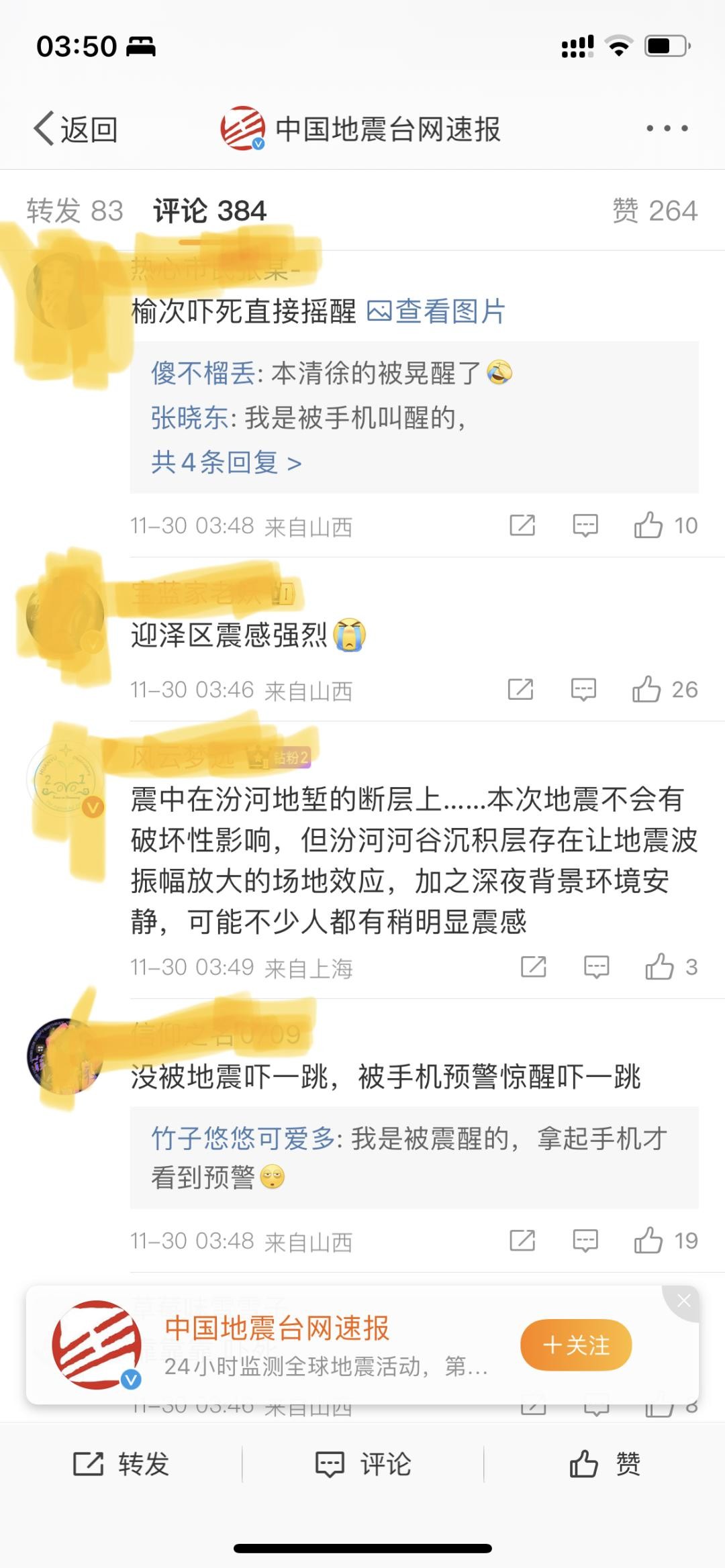 有网友表示一点感觉都没有,也有网友说从睡梦中惊醒,被吓哭了。还有人说被手机提示给叫醒了,并配上收到的地震预警提示。