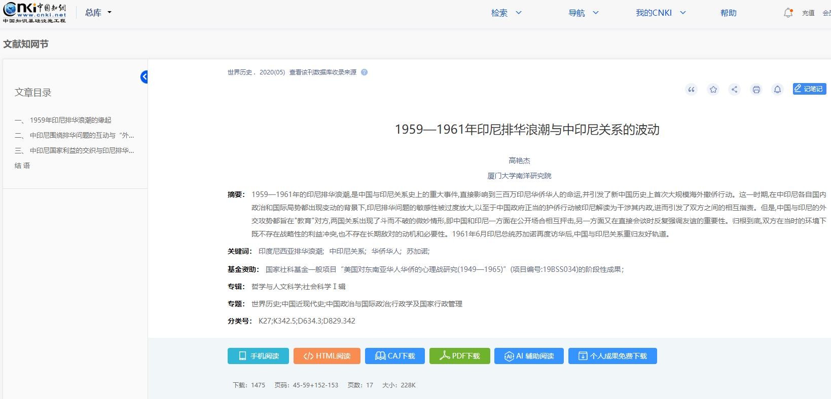 2、中国知网:《1959—1961年印尼排华浪潮与中印尼关系的波动》