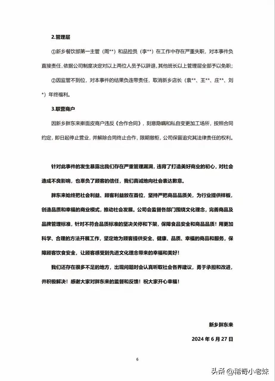 2024年6月27日凌晨,胖东来商贸集团在其官方公号上发布了一份《关于新乡胖东来餐饮商户“擀面皮加工场所卫生环境差”的调查报告》,这份报告不仅详细披露了事件的来龙去脉,还公布了针对消费者的赔偿措施。消费者纷纷对胖东来的负责态度表示赞赏。
