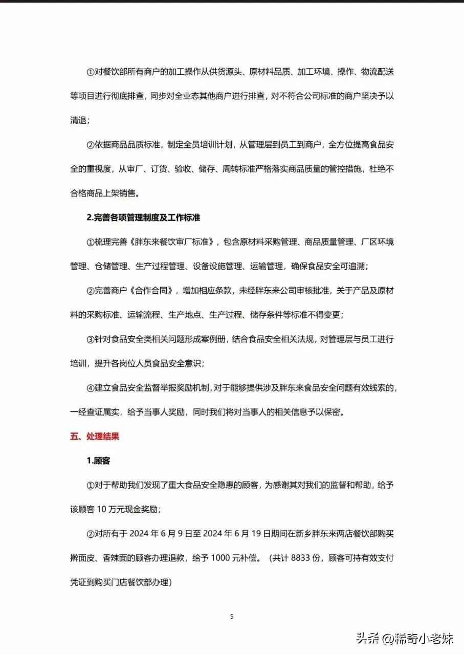 在确认问题后,胖东来迅速制定了赔偿方案。他们决定给最先曝光此事的举报人10万元奖金,对所有于2024年6月9日到2024年6月19日这段时间内,在新乡胖东来餐饮部购买擀面皮、香辣面的顾客办理全额退款,并每人再发1000元的额外补偿。这方案一经公布,网友基本被炸的外焦里嫩,纷纷向胖东来竖起了大拇指!