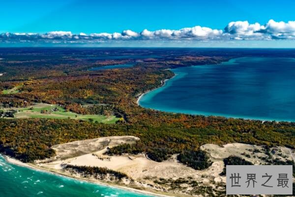 密歇根湖是一片面积达5.8平方公里的唯一全部属于美国的湖泊,湖岸线蜿蜒曲折达2100公里,整体水深平均达84米,深度由北向南递减,水深最深处达282米,整体蓄水量为4875立方千米,芝加哥和密尔沃基为这片湖泊的主要湖港。