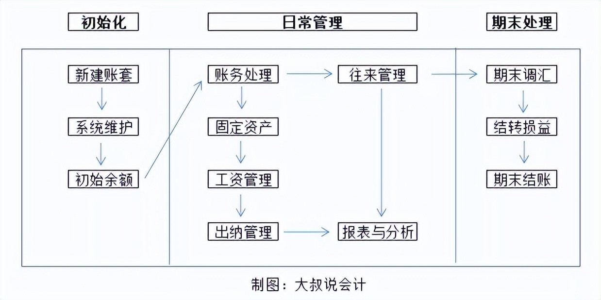 金蝶的初始建账流程,在系统初始化设置部分主要5个方面:
