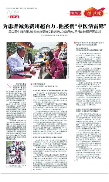 本报讯3月28日,大河报·豫视频率先以《为患者减免费用超百万,他被赞“中医活雷锋”》为题,对周口市魏氏血液病医院(又名周口开元医院)院长魏兴禹的先进事迹进行了大篇幅重磅报道。报道刊发后,引发强烈反响,周口市委主要领导作出批示,要求大力宣传中医魏兴禹的事迹。目前,周口市正在掀起宣传“中医活雷锋魏兴禹”的热潮。