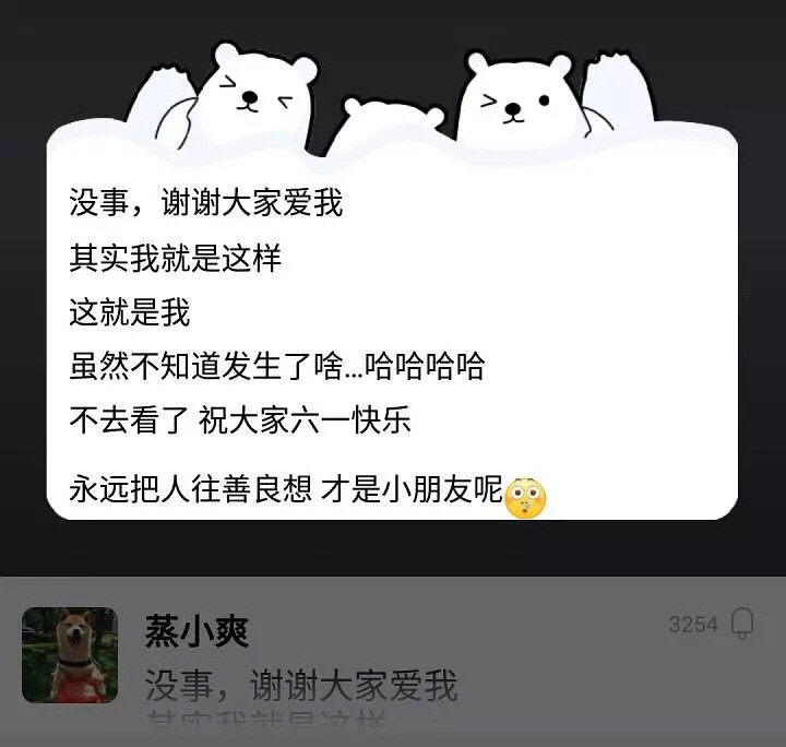 面对这件事,今天凌晨郑爽在社交平台上回复了这场风波:“没事,谢谢大家爱我。其实我就是这样,这就是我,虽然不知道发生了啥,哈哈哈哈。不去看了,祝大家六一快乐。永远把人往善良想,才是小朋友呢。”