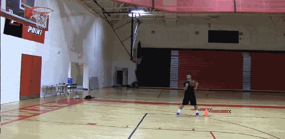 持球者用右手运球,从右路突破(当然先做个假动作更好),防守队员一定在左侧跟着你跑,当球运到自己的射程范围之内(离篮筐越近命中率越高),突然向左侧靠一下防守队员,使其以为你向左侧突破,这个动作也为你后仰跳投创造了运动空间。这时,突然收回,做出一个左脚在前右脚在后的姿势(注意:这时就要作好跳投的一切准备了)。此时,你面对篮筐,但要使篮筐和你的两个肩头在一条直线上,然后直接跳起。在上升过程中,上肢保持平时的投篮姿势,右腿会自然向前摆出。很好,可以用手臂力量轻松投篮了,球进!