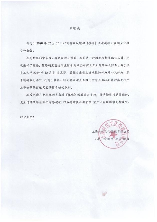 《镇魂》主演戏服被公开售卖 出品方发布严正声明