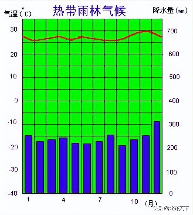 热带雨林气候位于各洲的赤道两侧,向南、北延伸5°~10°左右,如南美洲的亚马孙平原,非洲的刚果盆地和几内亚湾沿岸,亚洲东南部的一些群岛等。这些地区位于赤道低压带,气流以上升运动为主,水汽凝结致雨的机会多,全年多雨,无干季,年降水量在2,000 毫米以上,最少雨月降水量也超过60 毫米,且多雷阵雨;各月平均气温为25°~28℃,全年长夏,无季节变化,年较差一般小于3℃,而平均日较差可达6°~ 12℃。在这种终年高温多雨的气候条件下,植物可以常年生长,树种繁多,植被茂密成层。