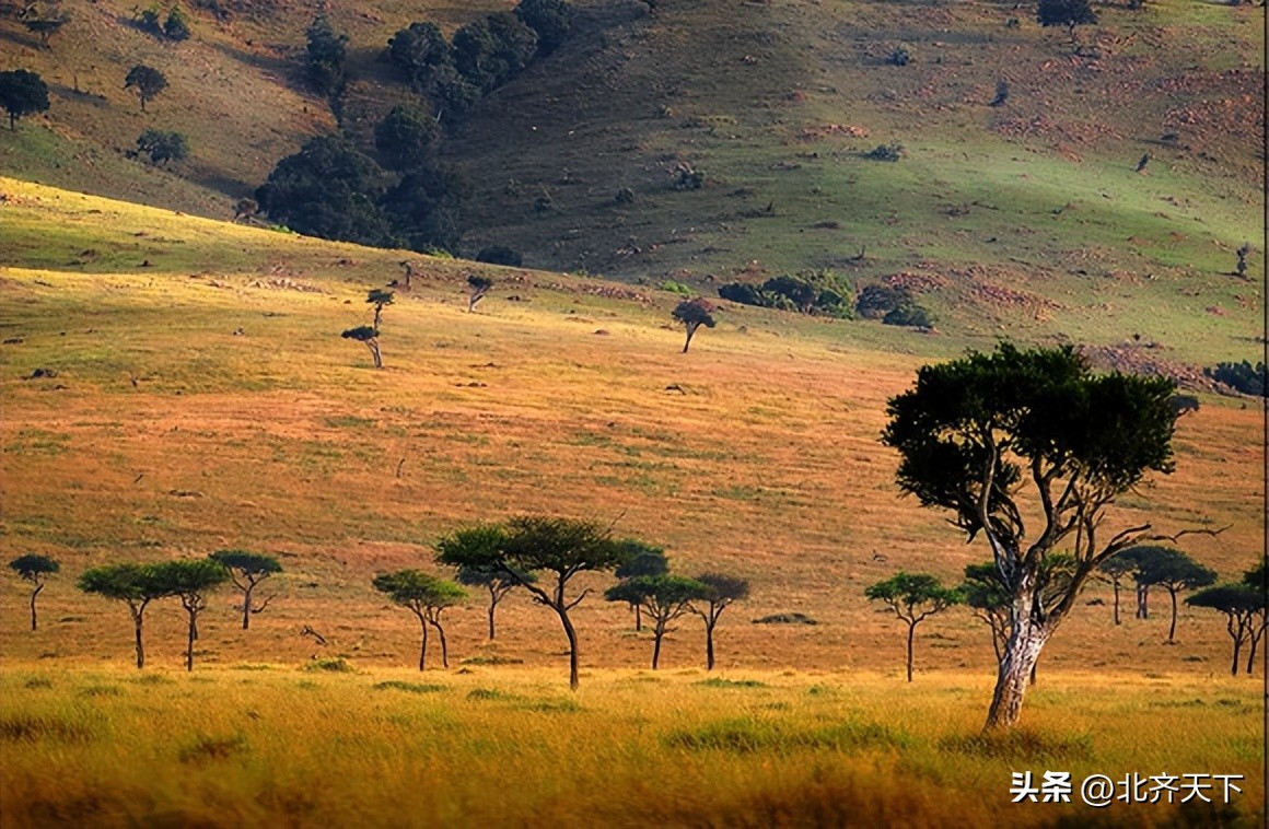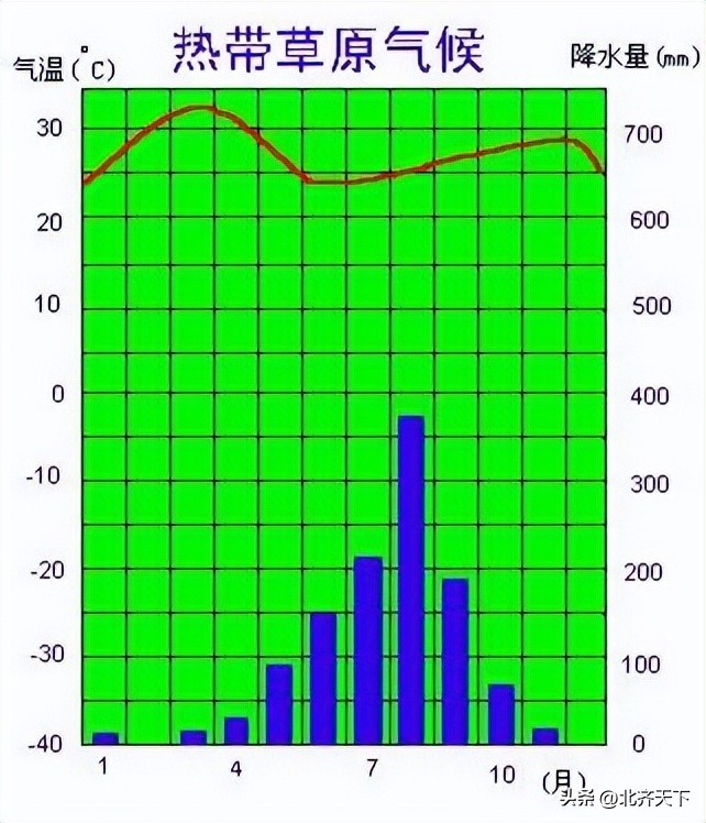 热带草原气候这种气候主要分布在赤道多雨气候区的两侧,即南、北纬5°~15°左右(有的伸达25°)的中美、南美和非洲。其主要特点,首先是由于赤道低压带和信风带的南北移动、交替影响,一年之中干、湿季分明。年降水量一般在700—1000毫米。当受赤道低压带控制时,盛行赤道海洋气团,且有辐合上升气流,形成湿季,潮湿多雨,遍地生长着稠密的高草和灌木,并杂有稀疏的乔木,即稀树草原景观。当受信风影响时,盛行热带大陆气团,干燥少雨,形成干季,土壤干裂,草丛枯黄,树木落叶。与赤道多雨气候相比,一年至少有1~2 个月的干季。其次是全年气温都较高,具有低纬度高温的特色,最冷月平均温度在16°~18℃以上。最热月出现在干季之后、雨季之前,因此,本区气候一般年分干、热、雨三个季节。气温年较差稍大于赤道多雨气候区。