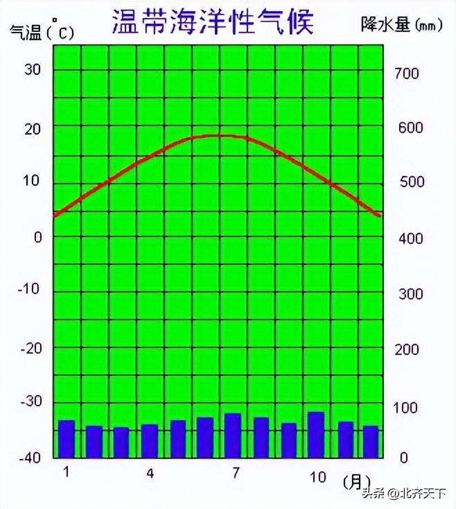 温带海洋性气候位于大陆西岸,南、北纬40°~60°地区。终年处在西风带,深受海洋气团影响,沿岸又有暖流经过,冬无严寒,夏无酷暑,最冷月平均气温在0℃以上,最热月在22℃以下,气温年、日较差都小。全年都有降水,秋冬较多,年降水量在1,000 毫米以上,在山地迎风坡可达2,000~3,000 毫米以上。这种气候在西欧最为典型,分布面积最大,在南、北美大陆西岸相应的纬度地带以及大洋洲的塔斯马尼亚岛和新西兰等地也有分布。