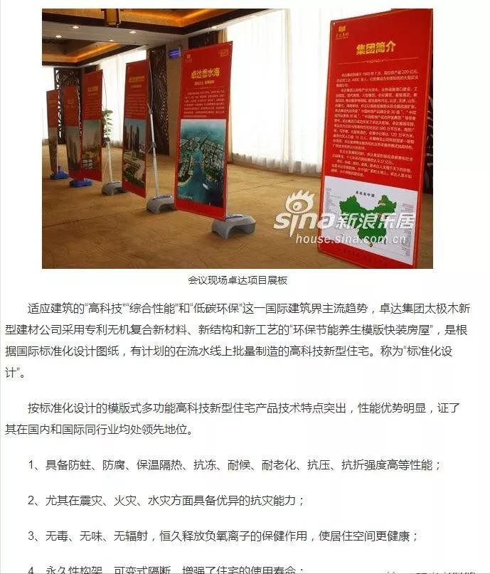 河北太极木新型材料有限责任公司,是一家注册在河北省廊坊市固安县固安镇柏村村委会的企业,这家企业虽然规模不大,但远销海外.从报道中我们也看到了在卓达新材的宣传材料中屡次出现的场景,一套正在搭建中的花园洋房。事实上杨卓舒正是看到了太极木的这种国际化市场,才被吸引过来,最终花费了巨资,收购了太极木公司的全部资产。太极木的老板纪勇顺理成章的成为了卓达的高管,而那些厂房和客户关系,也一起被招致了卓达的麾下。虽然卓达以高于正常估值十余倍的价格收购了太极木,但杨卓舒本人仿佛对这项技术充满信心。从现在的情况来看,杨应该是被纪勇忽悠了,而且骑虎难下。文中提到了卓达集团太极木新型建材有限公司自主研发的新型高科技建材,时间是在2011年。文中提到太极木的总经理纪勇,也是在2011年。