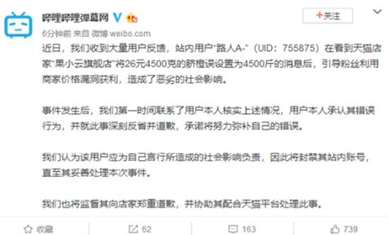 回应还表示,B站收到大量用户反馈,站内用户“路人A-”(UID:755875)在看到天猫店家“果小云旗舰店”将26元4500克的脐橙误设置为4500斤的消息后,引导粉丝利用商家价格漏洞获利,造成了恶劣的社会影响。事件发生后,我们第一时间联系了用户本人核实上述情况,用户本人承认其错误行为,并就此事深刻反省并道歉,承诺将努力弥补自己的错误。