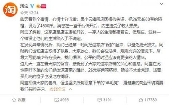 7号中午,针对该事件,淘宝官方微博也发布消息称,在发现异常情况后,淘宝已第一时间把店家“保护”起来,以避免更多损失。同时会在法律、规则允许的情况下,尽最大可能减少各方损失。