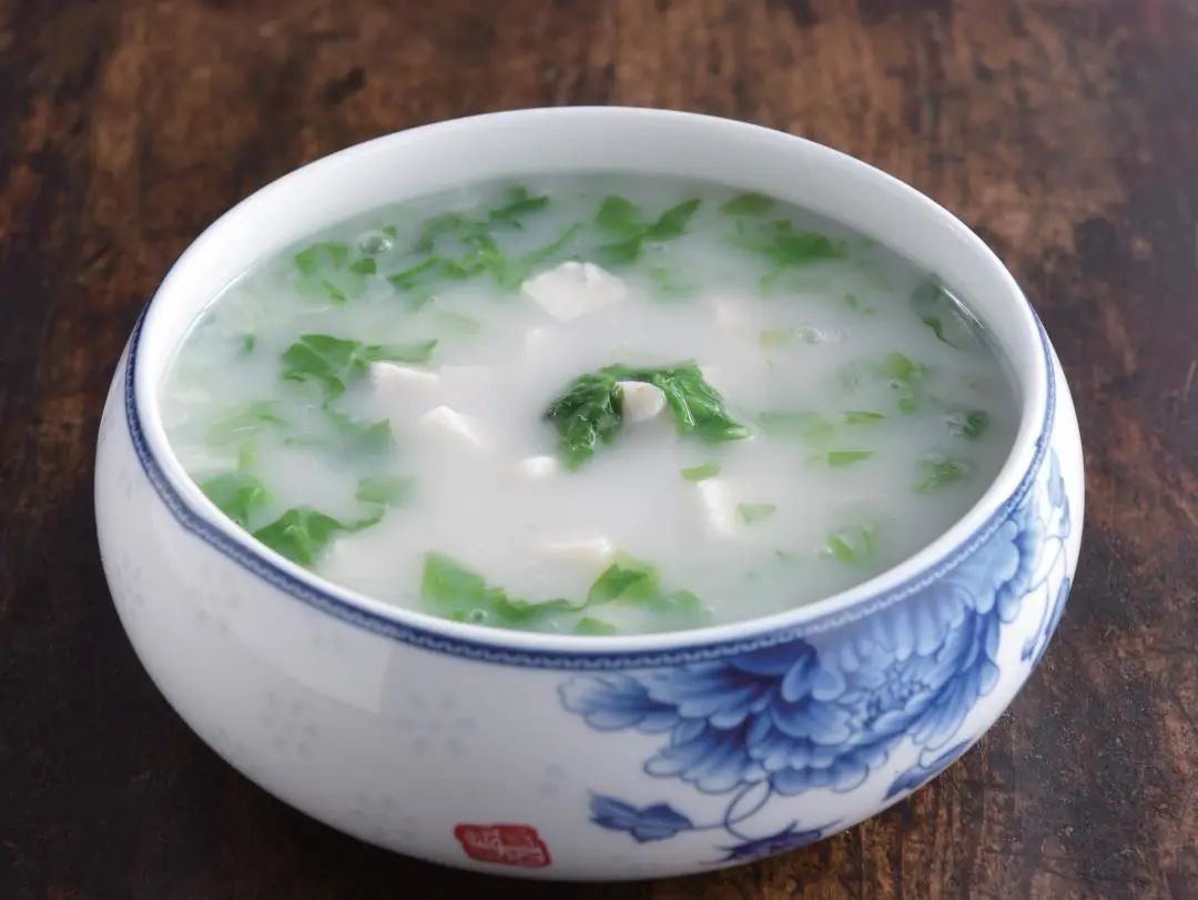 原料:去皮芋头250克、小白菜50克、米汤、盐、鸡精各适量制作:1. 将芋头切成块,入水锅煮熟,倒出沥水。另把小白菜切成段。2. 锅中倒入米汤,下入熟芋头块,烧开后放入小白菜段,调入少许盐和鸡精烧开,撇去浮沫即可。