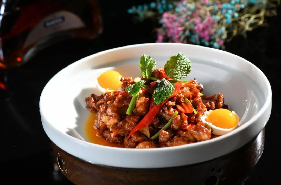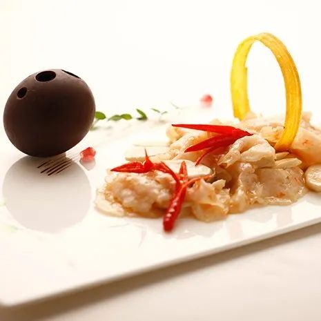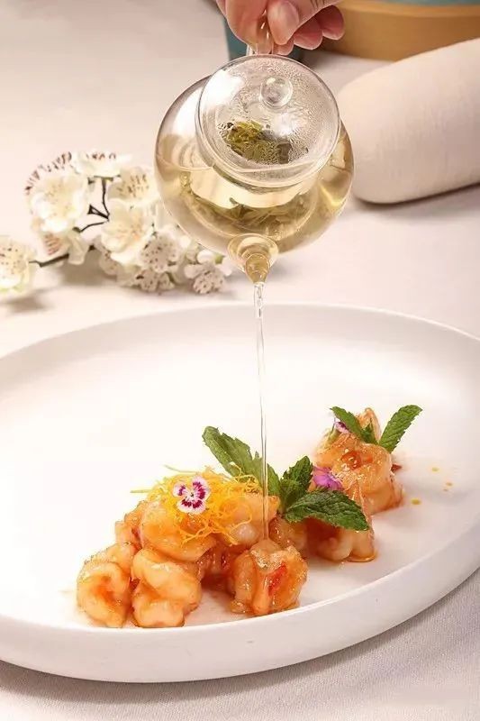 4、锅入底油烧至五成热,下泰国鸡酱30克、宫保汁15克炒至出香,倒入炸好的虾仁翻匀。起锅装入圆盘一端,点缀鲜花、薄荷叶、炸红薯丝,在圆盘的另一端放入一壶刚刚沏好的雨花茶汁即可走菜。上桌后服务员将少许茶汁浇在虾仁上,再请客人品尝,既能解油腻,又具仪式感。
