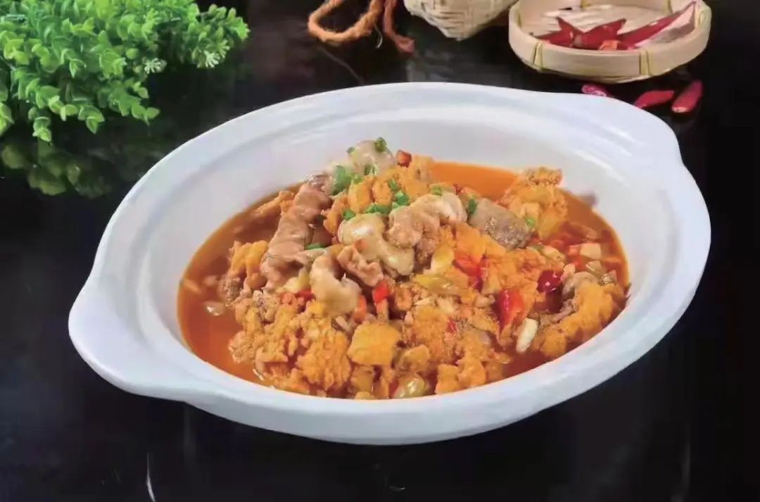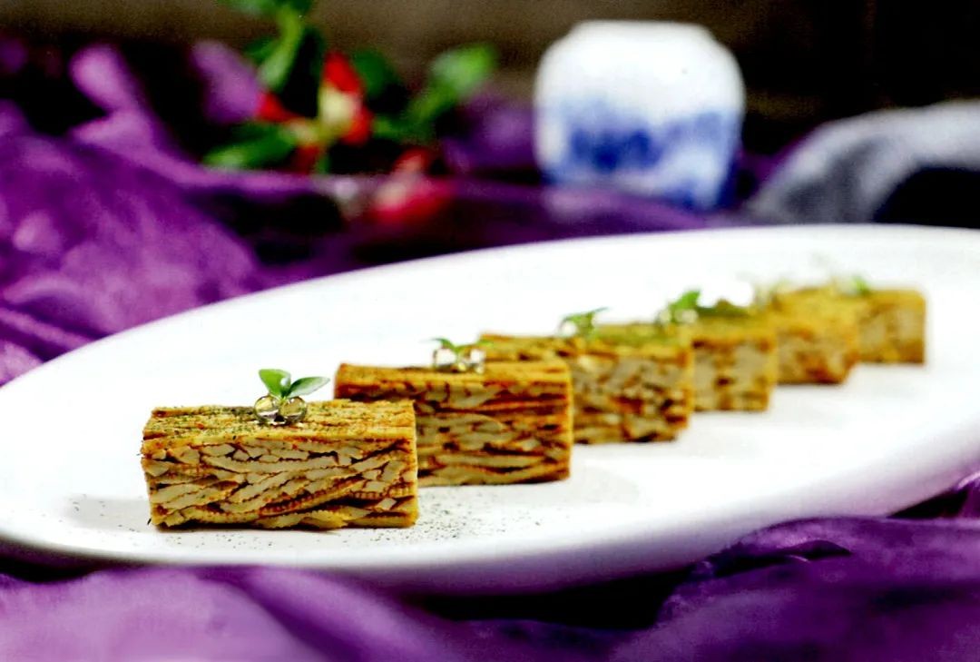 高碑店豆腐丝750克,土耳其烧烤料20克,红甜椒粉、白糖、香菜粉各5克,色拉油适量。制作:1、将豆腐丝加土耳其烧烤料、红甜椒粉、白糖拌匀,放入真空袋中抽真空,入蒸箱蒸15分钟,放入托盘中用重物压一晚至定型;2、平底锅入色拉油烧热,下豆腐丝块煎至金黄、起酥,改刀切块后码盘,撒香菜粉,做点缀即可。酸菜乌鱼片