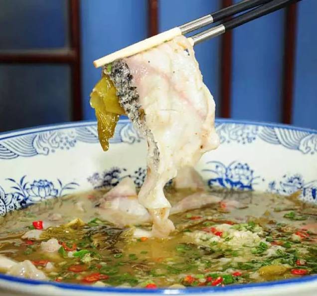 4.腌制好的凌波鱼片650克放入微沸的水中焯至刚刚成熟,捞出控水。取配料(泡红萝卜、泡青笋各80克,泡娃娃菜180克)放入烧开的酸汤中焯熟,捞出放入容器内垫底,再将鱼片放入酸汤中煮熟,捞出放在配料上。酸汤里加南瓜泥30克调色,出锅浇在容器内。