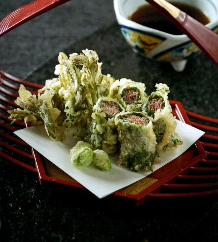 制作:1、将蔬菜苗择净,与蚕豆粒分别洗净,擦干水分,拍匀天妇罗粉,蘸匀自制炸糊,下180°C至200℃热油中炸至成熟,控油码盘备用;2、将和牛加盐、黑胡椒碎码入底味,用苏子叶卷起,拍匀天妇罗粉,蘸匀自制炸糊,下180°C至200°C热油中炸熟,捞出控油,一切二,放入盘中,配自制天妇罗汁一同上桌即可。