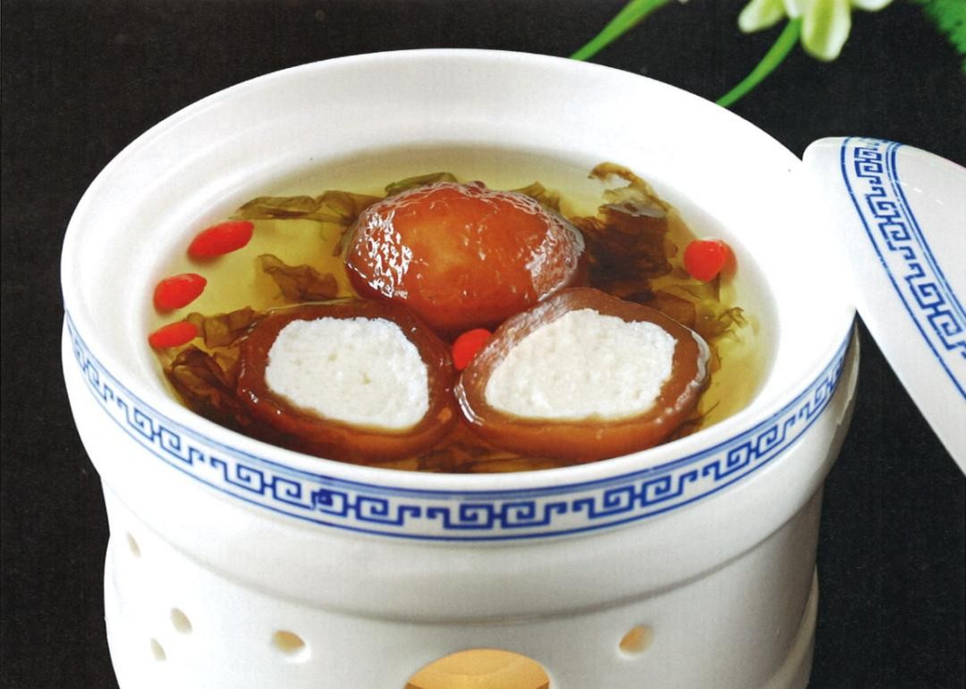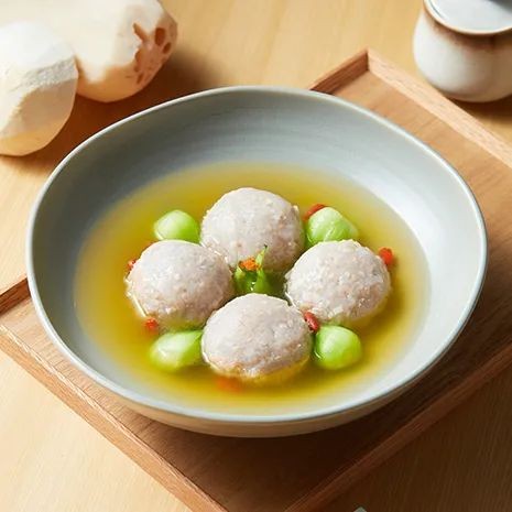 净青鱼肉100克,纯藕粉150克,干紫菜10克,枸杞20克,清汤1000克,盐味汁、打馅料汁各适量。制作:1、将青鱼肉泡洗干净,斩成泥状,加入打馅料汁和适量清水,搅打成鱼馅,再分别用汤勺挤成每只2克的小圆球,滚上一层干藕粉,入冰箱冷冻定型待用;2、锅入水烧沸,将定型的藕粉圆生坯放入漏勺,入沸水汆烫一下,取出,再滚上一层藕粉,下沸水汆烫,反复四五次,下沸水锅煮透待用;3、锅入清汤烧沸,加盐味汁调味,分装在各客盅内,放入泡好的紫菜、藕粉鱼圆,点缀枸杞即可。