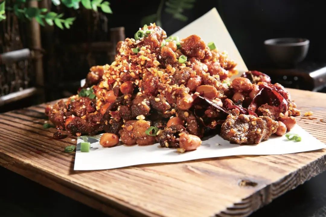 3.净锅入红油烧热,下入干灯笼椒、干锅酱炒香,加入炸好的牛肉丁、味精、鸡精、白糖、十三香、胡椒粉、孜然粉、油酥辣椒籽、油炸花生米炒匀,淋花椒油、芝麻油,撒入熟花生碎炒匀,起锅摆入垫有餐纸的盘中,撒葱花,稍装饰即可。