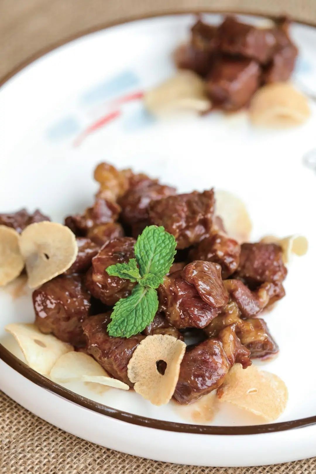 原料:雪花牛肉300克、大独蒜50克、蒜瓣10克、姜块10克、小葱节40克、洋葱30克、小香菜10克、胡萝卜50克、蚝油10克、白糖1克、一品鲜酱油20毫升、松肉粉1克、十三香1克、胡椒粉2克、蒜油30毫升、黄油50克、盐、味精、生粉各适量制作:1. 将雪花牛肉切成拇指大小的丁,漂净血水,搌干多余水分备用。2. 将蒜瓣、姜块、小葱节、洋葱、小香菜、胡萝卜加清水500毫升,入果汁机打成汁过滤去渣,往蔬菜汁中加一品鲜酱油、松肉粉、胡椒粉、十三香、适量生粉调匀,下牛肉丁腌制2小时。3.将牛肉丁捞出沥干水分。平底锅入黄油烧化,下牛肉丁中火煎至八分熟,倒出。4. 将大独蒜切成均匀薄片,入清水中,加盐、白糖泡一下,去掉多余苦涩味,倒出搌干水分,再入三成热油锅炸至色金黄,倒出沥油。5.锅入蒜油,入牛肉丁炒香,调入蚝油、味精、白糖、胡椒粉炒匀,加炸好的蒜片翻匀,摆盘装饰即可。