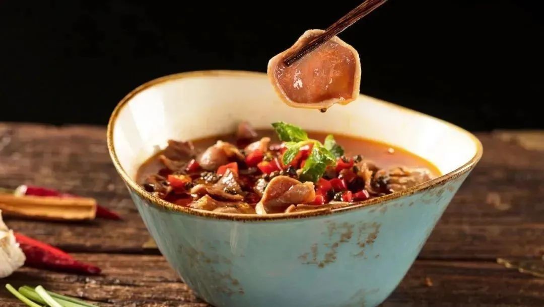 3. 锅内入油,姜,蒜片爆香入高汤,将调料(干青花椒、藤椒油)除外调匀,倒入猪舌片略煮入味,加入藤椒油起锅装盘;