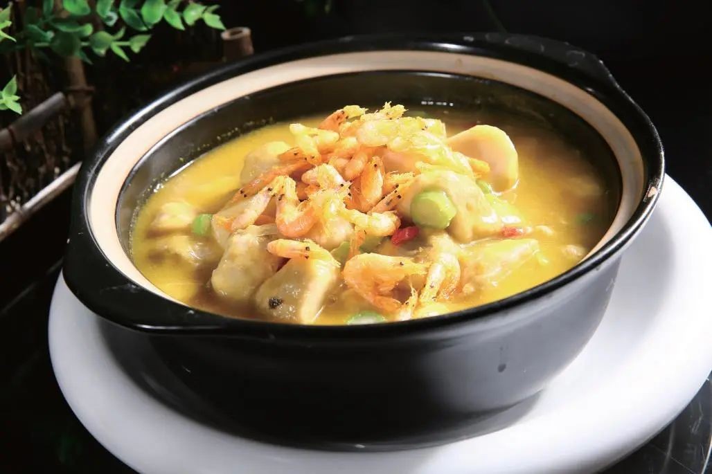 原料:毛芋头700克、小河虾50克、姜米20克、菜心梗粒50克、白糖2克、胡椒粉1克、盐5克、高汤500毫升、鸡油50克、味精、鸡精、混合粉、色拉油各适量制作:1.将毛芋头治净,蒸熟后去皮,切成大块,下入加有适量盐的开水锅汆水,倒出沥水。2.锅入鸡油烧热,下姜米炒香,加入高汤、盐、芋头块、味精、鸡精、白糖、胡椒粉煮入味,大火收汁至浓稠,撒入菜心梗粒稍煮,倒入砂煲。3.将小河虾洗净沥水,加盐、胡椒粉、混合粉(吉士粉与生粉按1∶1的比例混合) 拌匀,下入烧至五成热油锅炸至色金黄,倒出沥油后撒在芋头上,点缀枸杞即可。