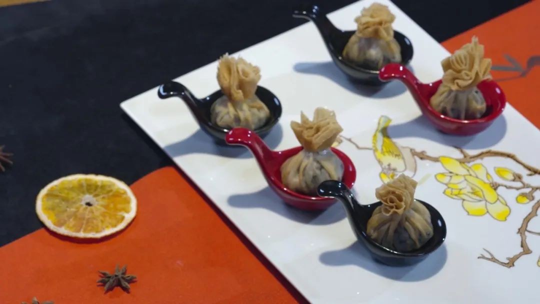 3、摊开一块春卷皮,紫菜放中间,馅放在紫菜上面,加入一粒鹅肝,包起用韭黄扎好,剪去多余部份,成石榴球。将锅中烧油至五成热,放入石榴球炸至金黄色,摆盆造型即可。