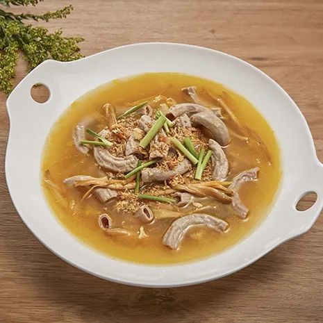 2. 净锅入底油煸香三层肉丝,放入二汤200克调味,加黄花菜煮三分钟,放入小肠煨好,装盘放入干葱头,芹菜末即可。