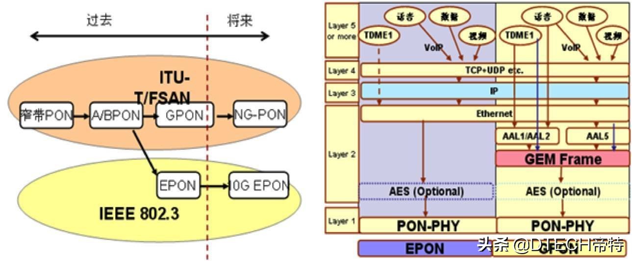 下图展示了EPON和GPON技术未来发展的方向、各自的协议栈及支持的业务类型。
