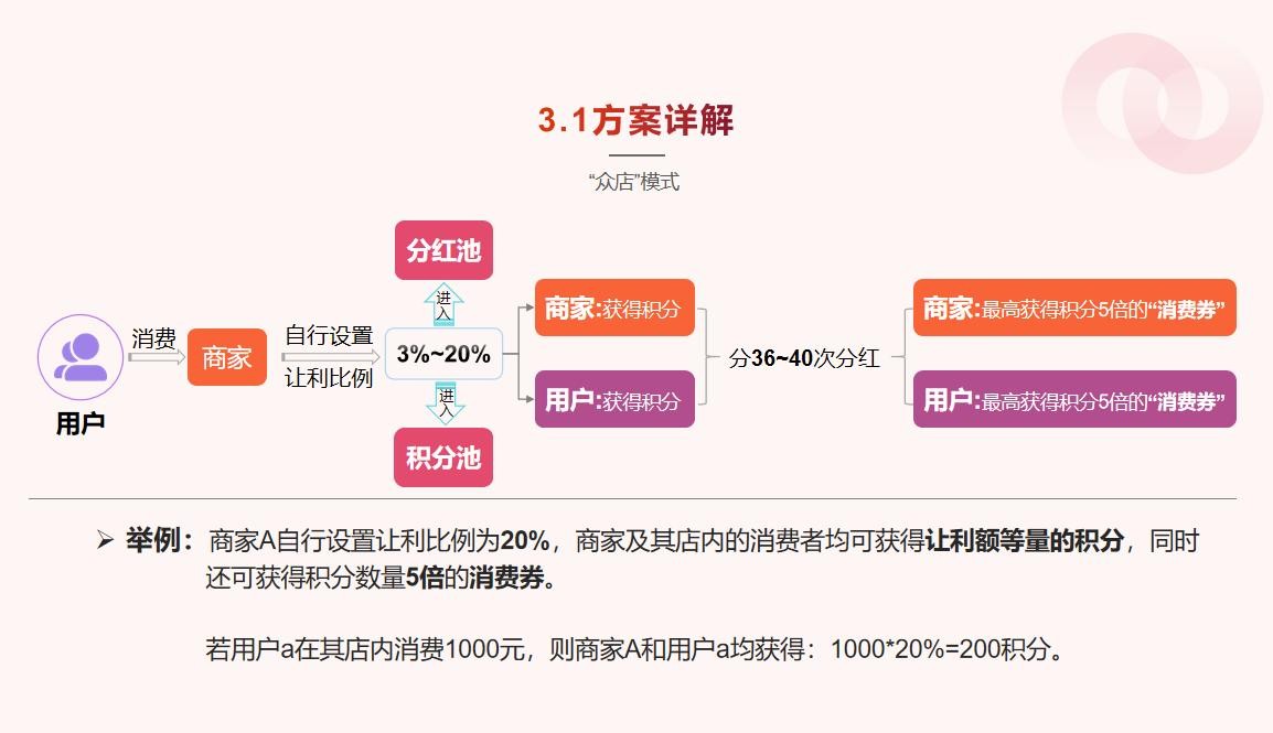 第一期你消费 1000,得 200 积分,平台拿 1% 分红,你和商家各拿 1 块消费券。