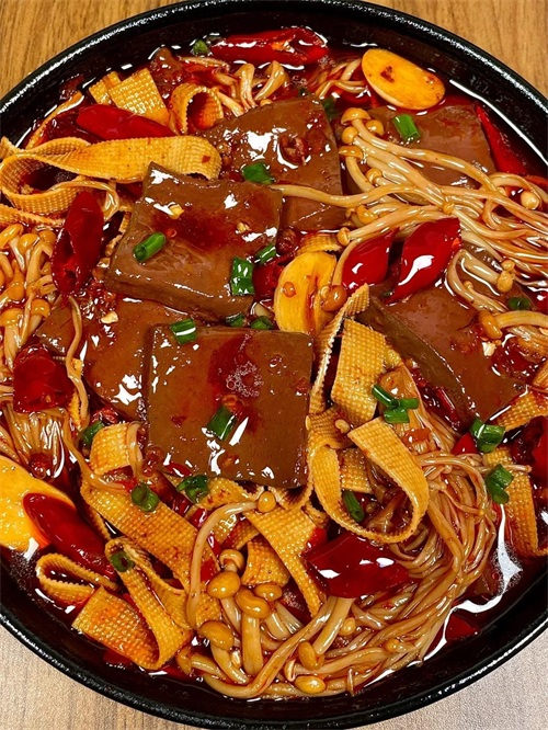 毛血旺,作为重庆的特色火锅菜品之一,宛如一场热闹非凡的食材与麻辣的华丽舞会。以麻辣鲜香、食材丰富而著称,选用多种食材如牛百叶、牛肚、猪肝等,这些食材就像一群各具特色的舞者,牛百叶的爽脆、牛肚的嚼劲、猪肝的鲜嫩,每一种都散发着独特的魅力。搭配辣椒、花椒等调料炒制,辣椒和花椒就像舞会的领舞者,它们的热烈与麻爽引领着整个舞台的节奏。