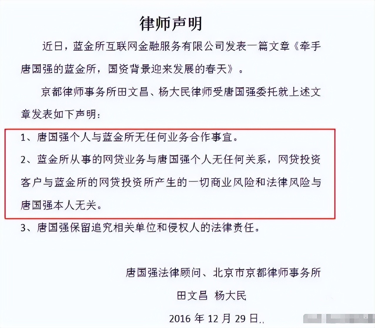 看到自己的代言犯法了,唐国强方只是发了个声明,撇清了跟该公司的业务往来。
