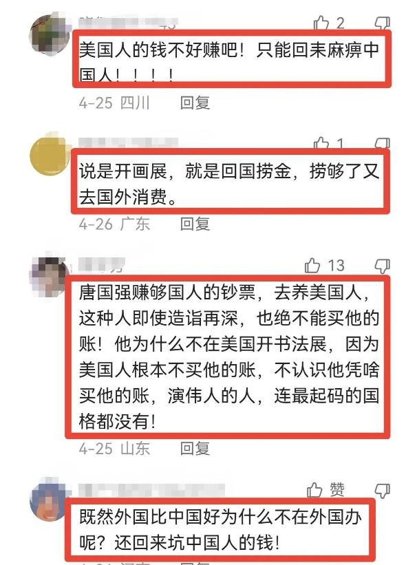 此类的话层出不穷,网友们将唐国强之前亲美的事情和圈钱的事情联系在一起,看出了唐国强的意图,在我国圈钱去美国花。