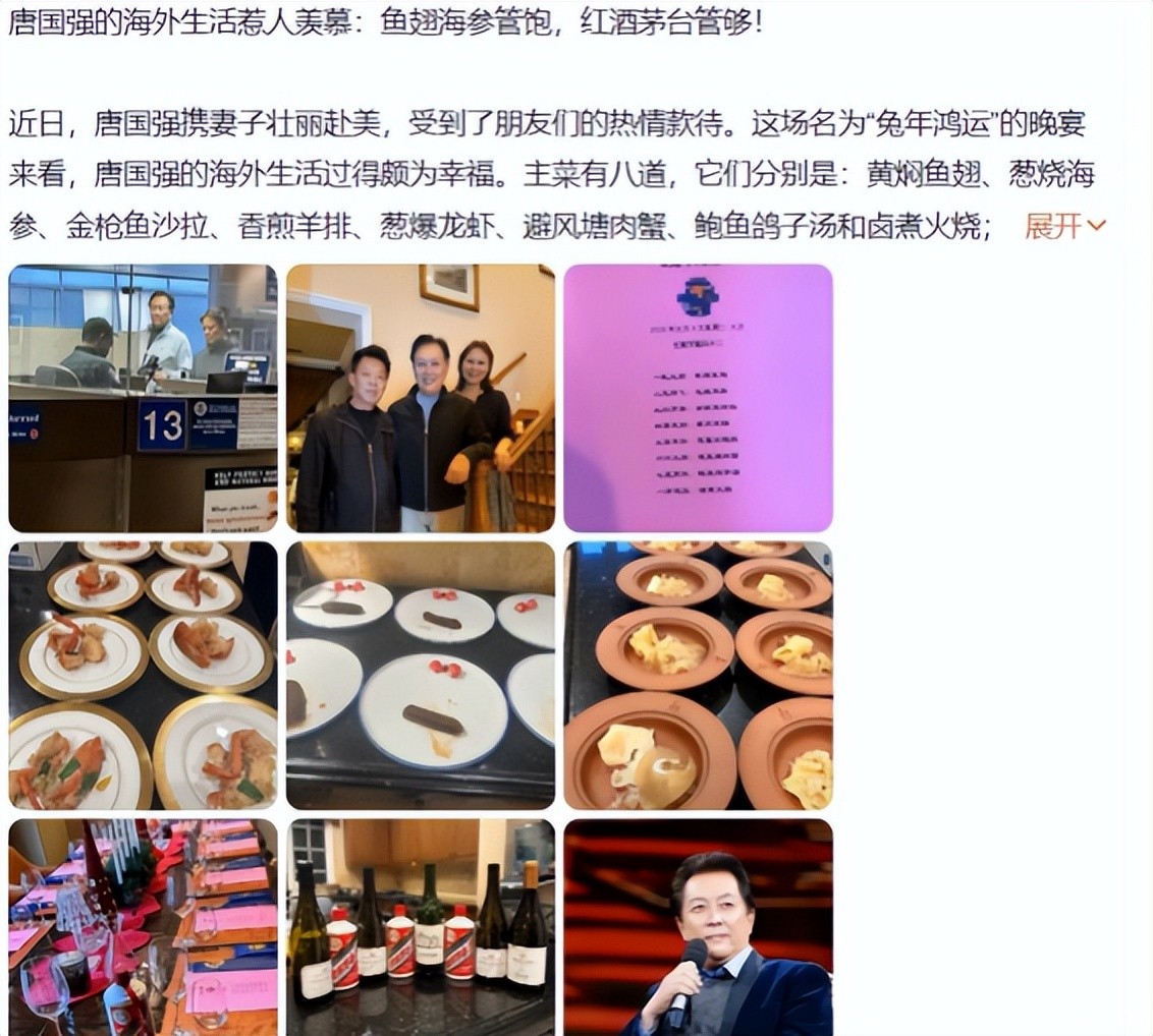 从这些发文中不难看出,唐国强的生活非常奢靡,鱼翅海参、红酒茅台样样管够,这一餐下来没个几万都不行,小编也只是预估这些菜品的价格,如若不对评论区指正!