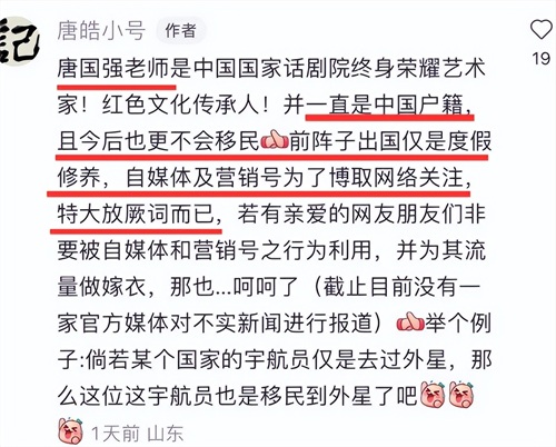 这个事情被传回国内后,唐国强被网友们讨伐忘本,不要顶着那张演伟人的脸,做着亲美的事情,随着事情越演越烈,唐国强工作室赶紧出来辟谣。