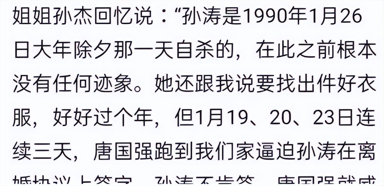 最后孙涛走上了偏激的道理,在1990年的除夕夜,她选择自杀结束自己的生命,来个这段婚姻画上一个句号。