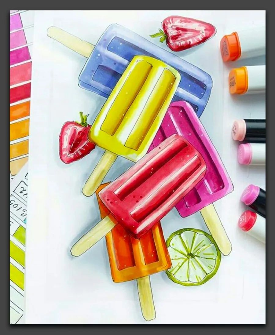 在运用马克笔绘画的过程中,可运用排笔、点笔、跳笔、晕化、留白等方法,表现出不同的色彩和质感。今天创意少儿美术馆为大家带来的作品欣赏,便是一组马克笔绘画的作品。这些作品里的题材,都是我们身边的寻常之物,比如蔬菜、水果、花卉等等,但是在绘画者们精心的色彩搭配下,将马克笔的涂色技法充分地运用,呈现出动人的色彩美感。