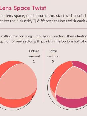 Khuri 认为棱镜空间通解是「折叠起来的球体」,将一个球体以一种非常复杂的方式折叠起来。要了解其工作原理,请从一个更简单的形状开始 —— 圆形,将它分成上下两半,然后将下半部分的每个点移动到上半部分与其截然相反的点。剩下的只有上半圆和两个对映点,半圆两端各有例子一个。这些必须相互粘在一起,形成一个较小的圆形,其圆周为原始圆周的一半。